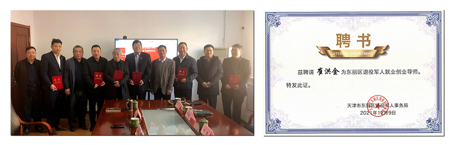 崔洪金董事长获得区退役军人事务局颁发的就业创业导师证书
