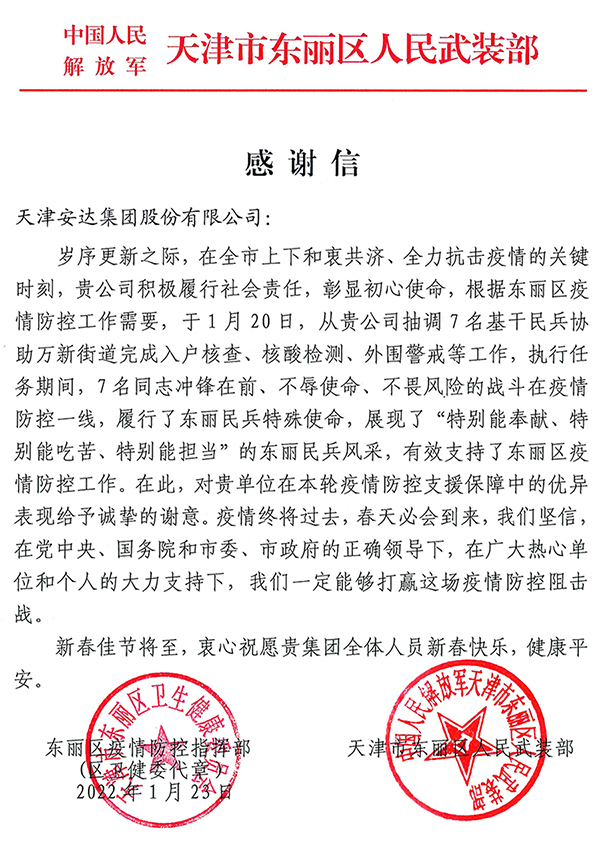 1月19日,市疫情防控指挥部发布2022年7号通告。为切实保障人民群众生命安全和身体健康,有力阻击疫情进一步扩散传播,巩固目前防控处置工作取得的成效,市疫情防控指挥部决定,将于1月20日6时起在全市范围开展第四次全员核酸检测。我集团民兵运输连积极响应上级单位号召,派出7位基干民兵协助万新街道完成入户核查、核酸检测、外围警戒等工作,受到东丽区疫情防控指挥部、东丽区人民武装部队的高度认可,并寄来感谢信。具体内容如下: